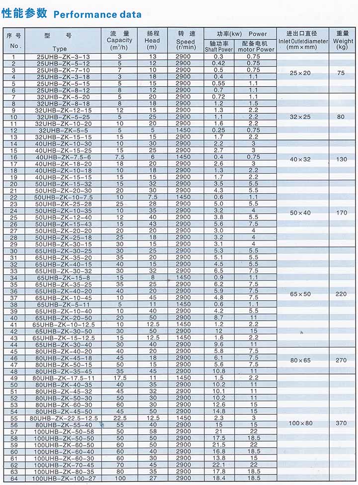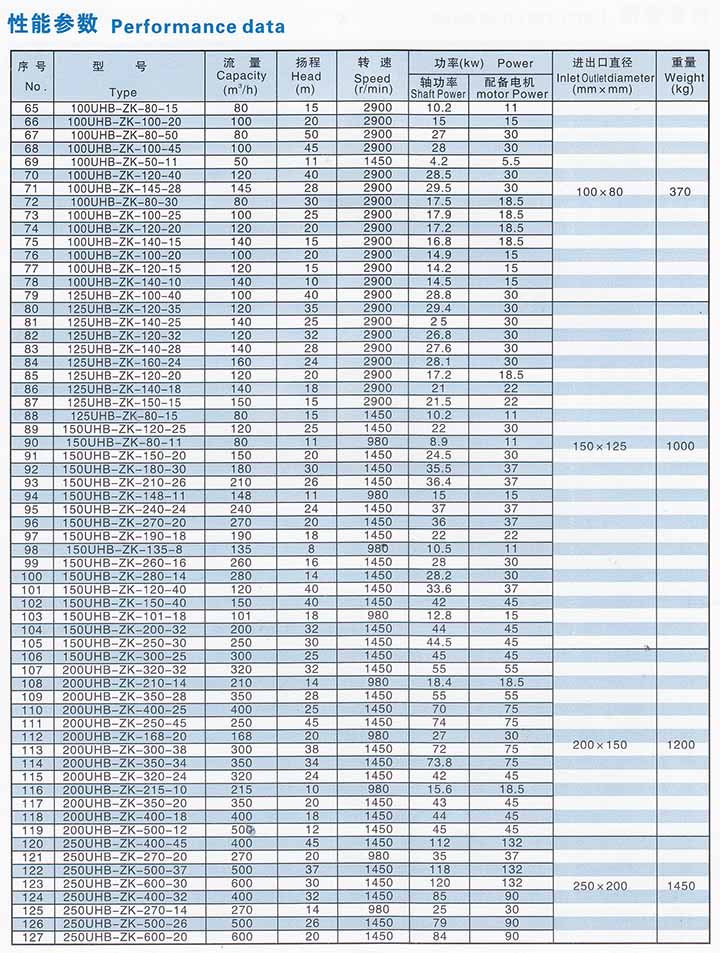 5.主要技術參數(shù):使用溫度-20℃~80℃(對特殊要求、使用改性材質,可提高到105℃),進口φ32mm~φ250mm。流量5~600m3/h,揚程50m以內。