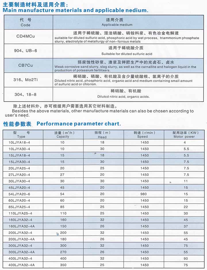 概述: LJYA系列料漿泵為單級(jí)單吸立式懸臂式離心液下泵。葉輪為半開式,葉輪前后均配有耐磨蓋,廣泛應(yīng)用于化工流程輸送含30%以下固體顆粒,粘度低于200CP的磨、腐蝕交互作用的介質(zhì)。特別適用于磷肥工業(yè)中輸送磷酸、磷銨料漿等介質(zhì)。 輸送介質(zhì)-般低于110℃。如需輸送更高溫度的介質(zhì),應(yīng)考慮用冷卻水冷卻軸承。 性能范圍:流量Q=1O~400m3/h 揚(yáng)程H=50m